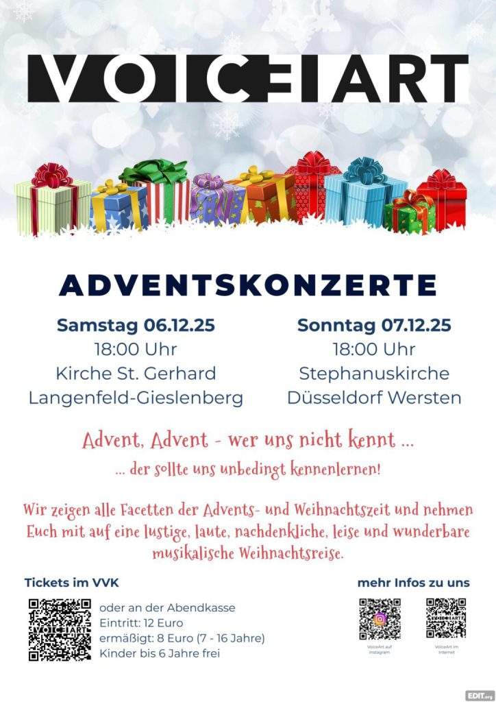 | 10 | Gospelchor Samstag, den 06.12.2025, 18:00 Uhr, Einlass 17:30 Uhr St. Gerhard Kirche Rheindorfer Str. 181, 40764 Langenfeld Eintritt: 12 Euro Tickets an der VVK oder auch Abendkasse Siehe Plakat unter der Tabelle! | https://www.voiceart-langenfeld.de/ ADVENTSKONZERT Langenfelder Chor „VOICEART“ |
